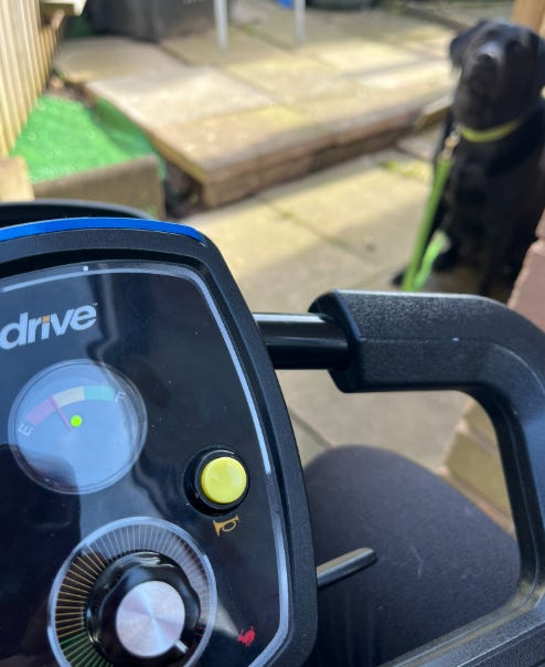 It’s so much better in the scooter, I feel much safer in that than I do driving my car. And Ollie gets more walking time. Matilda wants to come with us but her arthritis has got worse and just pottering around the garden can cause her pain. When I get more confident I will train Matilda to sit in the basket at the front or on my lap. But for now, Ollie and I are improving our skill base.