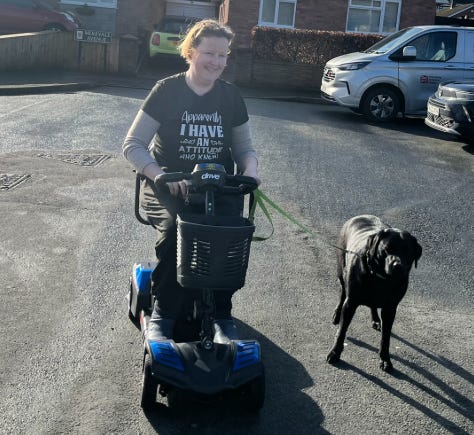Yes!!!! Finally, very slowly things are getting better! Thanks to an old friend who still looks as young as she did when I fucking met her over 20yrs ago FFS lol! My mobility scooter is in place and Ollie and I have worked on our skills so she is safe with my driving abilities!