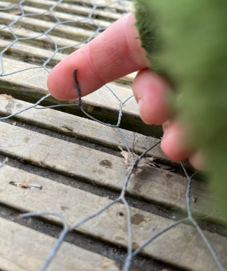 My mum and I tried to pull up the chicken wire that I tripped on, it was put on the decking around my shed as in frost/icy/snow the decking was so slippery I would get trapped in Gertie (my shed). It was amazing, but it started to break due to how much we walk on it and when it starts to break it just keeps breaking: